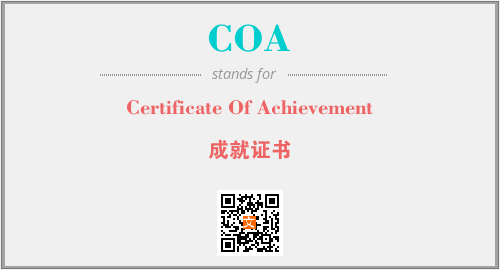 英文缩略词“COA”经常作为“Certificate Of Achievement”的英文缩写来使用,中文表示:“成就证书”。本文将详细介绍英文缩写词COA所代表英文单词,其对应的中文拼音、详细解释以及在英语中的流行度。此外,还有关于缩略词COA的分类、应用领域及相关应用示例等。