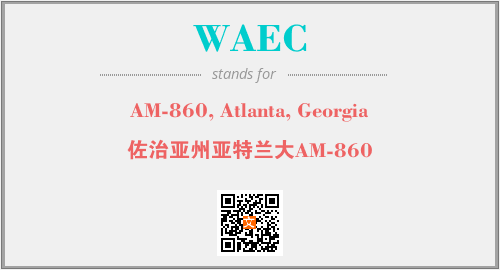 英文缩略词“WAEC”经常作为“AM-860, Atlanta, Georgia”的英文缩写来使用,中文表示:“佐治亚州亚特兰大AM-860”。本文将详细介绍英文缩写词WAEC所代表英文单词,其对应的中文拼音、详细解释以及在英语中的流行度。此外,还有关于缩略词WAEC的分类、应用领域及相关应用示例等。
