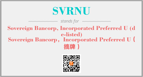 上述内容是“Sovereign Bancorp, Incorporated Preferred U (de-listed)”作为“SVRNU”的缩写,解释为“Sovereign Bancorp,Incorporated Preferred U(摘牌)”时的信息,以及英文缩略词SVRNU所代表的英文单词,其对应的中文拼音、详细解释以及在英文中的流行度和相关分类、应用领域及应用示例等。