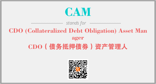 上述内容是“CDO (Collateralized Debt Obligation) Asset Manager”作为“CAM”的缩写,解释为“CDO(债务抵押债券)资产管理人”时的信息,以及英文缩略词CAM所代表的英文单词,其对应的中文拼音、详细解释以及在英文中的流行度和相关分类、应用领域及应用示例等。