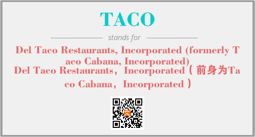 上述内容是“Del Taco Restaurants, Incorporated (formerly Taco Cabana, Incorporated)”作为“TACO”的缩写,解释为“Del Taco Restaurants,Incorporated(前身为Taco Cabana,Incorporated)”时的信息,以及英文缩略词TACO所代表的英文单词,其对应的中文拼音、详细解释以及在英文中的流行度和相关分类、应用领域及应用示例等。