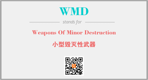 上述内容是“Weapons Of Minor Destruction”作为“WMD”的缩写,解释为“小型毁灭性武器”时的信息,以及英文缩略词WMD所代表的英文单词,其对应的中文拼音、详细解释以及在英文中的流行度和相关分类、应用领域及应用示例等。