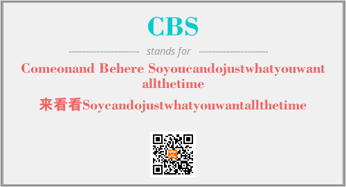 上述内容是“Comeonand Behere Soyoucandojustwhatyouwantallthetime”作为“CBS”的缩写,解释为“来看看Soycandojustwhatyouwantallthetime”时的信息,以及英文缩略词CBS所代表的英文单词,其对应的中文拼音、详细解释以及在英文中的流行度和相关分类、应用领域及应用示例等。