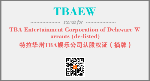 上述内容是“TBA Entertainment Corporation of Delaware Warrants (de-listed)”作为“TBAEW”的缩写,解释为“特拉华州TBA娱乐公司认股权证(摘牌)”时的信息,以及英文缩略词TBAEW所代表的英文单词,其对应的中文拼音、详细解释以及在英文中的流行度和相关分类、应用领域及应用示例等。