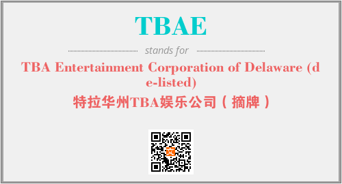 上述内容是“TBA Entertainment Corporation of Delaware (de-listed)”作为“TBAE”的缩写,解释为“特拉华州TBA娱乐公司(摘牌)”时的信息,以及英文缩略词TBAE所代表的英文单词,其对应的中文拼音、详细解释以及在英文中的流行度和相关分类、应用领域及应用示例等。