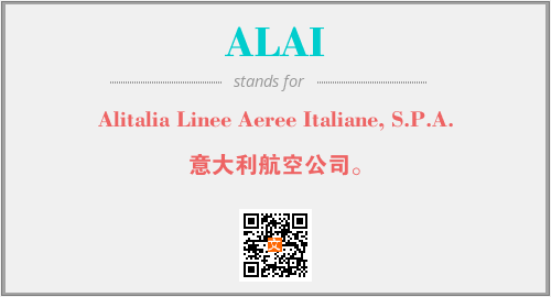 上述内容是“Alitalia Linee Aeree Italiane, S.P.A.”作为“ALAI”的缩写,解释为“意大利航空公司。”时的信息,以及英文缩略词ALAI所代表的英文单词,其对应的中文拼音、详细解释以及在英文中的流行度和相关分类、应用领域及应用示例等。