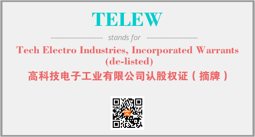 上述内容是“Tech Electro Industries, Incorporated Warrants (de-listed)”作为“TELEW”的缩写,解释为“高科技电子工业有限公司认股权证(摘牌)”时的信息,以及英文缩略词TELEW所代表的英文单词,其对应的中文拼音、详细解释以及在英文中的流行度和相关分类、应用领域及应用示例等。