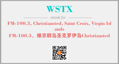 上述内容是“FM-100.3, Christiansted, Saint Croix, Virgin Islands”作为“WSTX”的缩写,解释为“FM-100.3,维京群岛圣克罗伊岛Christiansted”时的信息,以及英文缩略词WSTX所代表的英文单词,其对应的中文拼音、详细解释以及在英文中的流行度和相关分类、应用领域及应用示例等。