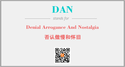 上述内容是“Denial Arrogance And Nostalgia”作为“DAN”的缩写,解释为“否认傲慢和怀旧”时的信息,以及英文缩略词DAN所代表的英文单词,其对应的中文拼音、详细解释以及在英文中的流行度和相关分类、应用领域及应用示例等。