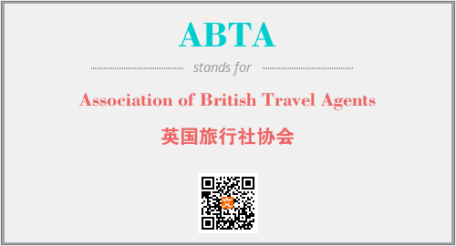 英文缩略词“ABTA”经常作为“Association of British Travel Agents”的英文缩写来使用,中文表示:“英国旅行社协会”。本文将详细介绍英文缩写词ABTA所代表英文单词,其对应的中文拼音、详细解释以及在英语中的流行度。此外,还有关于缩略词ABTA的分类、应用领域及相关应用示例等。