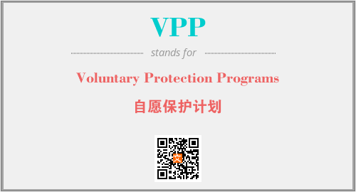 英文缩略词“VPP”经常作为“Voluntary Protection Programs”的英文缩写来使用,中文表示:“自愿保护计划”。本文将详细介绍英文缩写词VPP所代表英文单词,其对应的中文拼音、详细解释以及在英语中的流行度。此外,还有关于缩略词VPP的分类、应用领域及相关应用示例等。