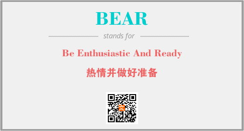 英文缩略词“BEAR”经常作为“Be Enthusiastic And Ready”的英文缩写来使用,中文表示:“热情并做好准备”。本文将详细介绍英文缩写词BEAR所代表英文单词,其对应的中文拼音、详细解释以及在英语中的流行度。此外,还有关于缩略词BEAR的分类、应用领域及相关应用示例等。