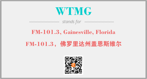 上述内容是“FM-101.3, Gainesville, Florida”作为“WTMG”的缩写,解释为“FM-101.3,佛罗里达州盖恩斯维尔”时的信息,以及英文缩略词WTMG所代表的英文单词,其对应的中文拼音、详细解释以及在英文中的流行度和相关分类、应用领域及应用示例等。