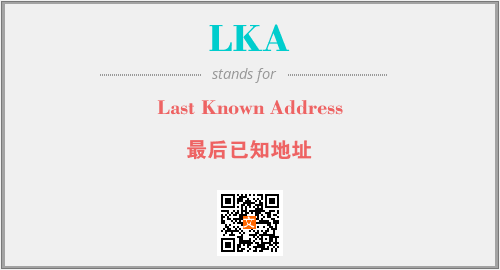 英文缩略词“LKA”经常作为“Last Known Address”的英文缩写来使用,中文表示:“最后已知地址”。本文将详细介绍英文缩写词LKA所代表英文单词,其对应的中文拼音、详细解释以及在英语中的流行度。此外,还有关于缩略词LKA的分类、应用领域及相关应用示例等。