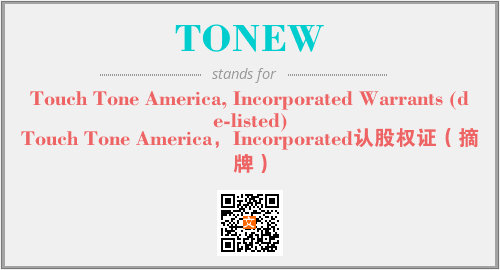 上述内容是“Touch Tone America, Incorporated Warrants (de-listed)”作为“TONEW”的缩写,解释为“Touch Tone America,Incorporated认股权证(摘牌)”时的信息,以及英文缩略词TONEW所代表的英文单词,其对应的中文拼音、详细解释以及在英文中的流行度和相关分类、应用领域及应用示例等。