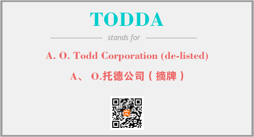 上述内容是“A. O. Todd Corporation (de-listed)”作为“TODDA”的缩写,解释为“A、 O.托德公司(摘牌)”时的信息,以及英文缩略词TODDA所代表的英文单词,其对应的中文拼音、详细解释以及在英文中的流行度和相关分类、应用领域及应用示例等。