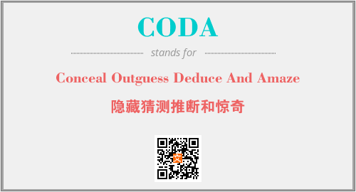 英文缩略词“CODA”经常作为“Conceal Outguess Deduce And Amaze”的英文缩写来使用,中文表示:“隐藏猜测推断和惊奇”。本文将详细介绍英文缩写词CODA所代表英文单词,其对应的中文拼音、详细解释以及在英语中的流行度。此外,还有关于缩略词CODA的分类、应用领域及相关应用示例等。