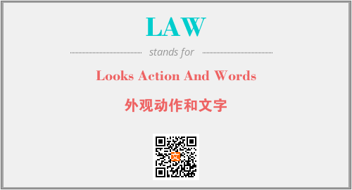 上述内容是“Looks Action And Words”作为“LAW”的缩写,解释为“外观动作和文字”时的信息,以及英文缩略词LAW所代表的英文单词,其对应的中文拼音、详细解释以及在英文中的流行度和相关分类、应用领域及应用示例等。