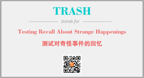 上述内容是“Testing Recall About Strange Happenings”作为“TRASH”的缩写,解释为“测试对奇怪事件的回忆”时的信息,以及英文缩略词TRASH所代表的英文单词,其对应的中文拼音、详细解释以及在英文中的流行度和相关分类、应用领域及应用示例等。