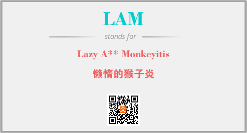英文缩略词“LAM”经常作为“Lazy A** Monkeyitis”的英文缩写来使用,中文表示:“懒惰的猴子炎”。本文将详细介绍英文缩写词LAM所代表英文单词,其对应的中文拼音、详细解释以及在英语中的流行度。此外,还有关于缩略词LAM的分类、应用领域及相关应用示例等。