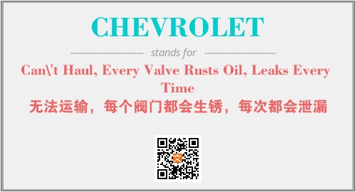 上述内容是“Can\'t Haul, Every Valve Rusts Oil, Leaks Every Time”作为“CHEVROLET”的缩写,解释为“无法运输,每个阀门都会生锈,每次都会泄漏”时的信息,以及英文缩略词CHEVROLET所代表的英文单词,其对应的中文拼音、详细解释以及在英文中的流行度和相关分类、应用领域及应用示例等。