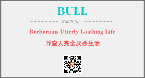上述内容是“Barbarians Utterly Loathing Life”作为“BULL”的缩写,解释为“野蛮人完全厌恶生活”时的信息,以及英文缩略词BULL所代表的英文单词,其对应的中文拼音、详细解释以及在英文中的流行度和相关分类、应用领域及应用示例等。