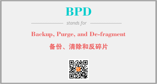 上述内容是“Backup, Purge, and De-fragment”作为“BPD”的缩写,解释为“备份、清除和反碎片”时的信息,以及英文缩略词BPD所代表的英文单词,其对应的中文拼音、详细解释以及在英文中的流行度和相关分类、应用领域及应用示例等。