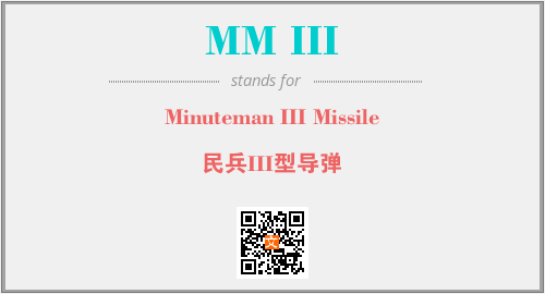 英文缩略词“MM III”经常作为“Minuteman III Missile”的英文缩写来使用,中文表示:“民兵III型导弹”。本文将详细介绍英文缩写词MM III所代表英文单词,其对应的中文拼音、详细解释以及在英语中的流行度。此外,还有关于缩略词MM III的分类、应用领域及相关应用示例等。