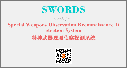 上述内容是“Special Weapons Observation Reconnaissance Detection System”作为“SWORDS”的缩写,解释为“特种武器观测侦察探测系统”时的信息,以及英文缩略词SWORDS所代表的英文单词,其对应的中文拼音、详细解释以及在英文中的流行度和相关分类、应用领域及应用示例等。