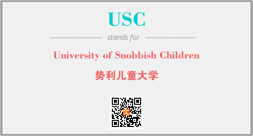 英文缩略词“USC”经常作为“University of Snobbish Children”的英文缩写来使用,中文表示:“势利儿童大学”。本文将详细介绍英文缩写词USC所代表英文单词,其对应的中文拼音、详细解释以及在英语中的流行度。此外,还有关于缩略词USC的分类、应用领域及相关应用示例等。