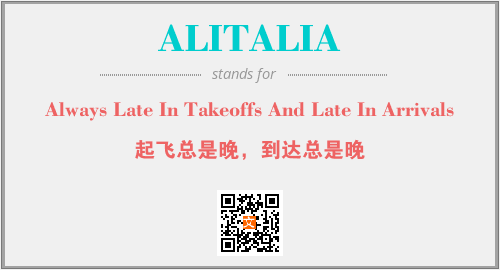 上述内容是“Always Late In Takeoffs And Late In Arrivals”作为“ALITALIA”的缩写,解释为“起飞总是晚,到达总是晚”时的信息,以及英文缩略词ALITALIA所代表的英文单词,其对应的中文拼音、详细解释以及在英文中的流行度和相关分类、应用领域及应用示例等。
