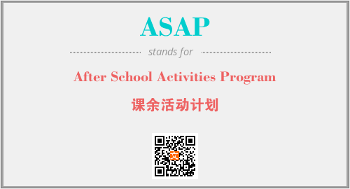 英文缩略词“ASAP”经常作为“After School Activities Program”的英文缩写来使用,中文表示:“课余活动计划”。本文将详细介绍英文缩写词ASAP所代表英文单词,其对应的中文拼音、详细解释以及在英语中的流行度。此外,还有关于缩略词ASAP的分类、应用领域及相关应用示例等。