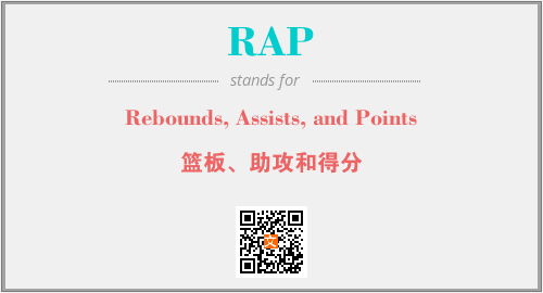 上述内容是“Rebounds, Assists, and Points”作为“RAP”的缩写,解释为“篮板、助攻和得分”时的信息,以及英文缩略词RAP所代表的英文单词,其对应的中文拼音、详细解释以及在英文中的流行度和相关分类、应用领域及应用示例等。