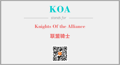上述内容是“Knights Of the Alliance”作为“KOA”的缩写,解释为“联盟骑士”时的信息,以及英文缩略词KOA所代表的英文单词,其对应的中文拼音、详细解释以及在英文中的流行度和相关分类、应用领域及应用示例等。