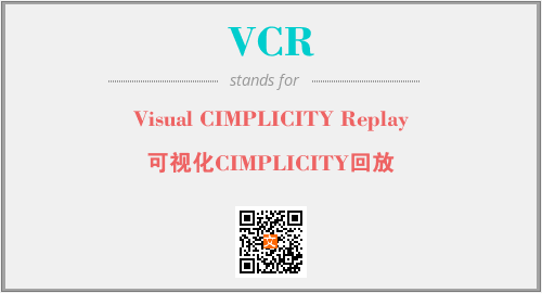 上述内容是“Visual CIMPLICITY Replay”作为“VCR”的缩写,解释为“可视化CIMPLICITY回放”时的信息,以及英文缩略词VCR所代表的英文单词,其对应的中文拼音、详细解释以及在英文中的流行度和相关分类、应用领域及应用示例等。