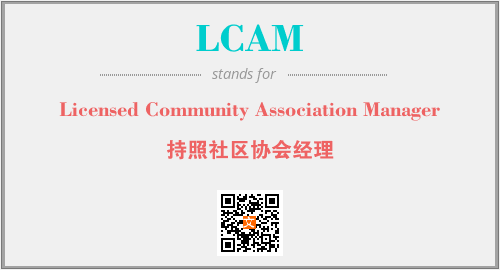 英文缩略词“LCAM”经常作为“Licensed Community Association Manager”的英文缩写来使用,中文表示:“持照社区协会经理”。本文将详细介绍英文缩写词LCAM所代表英文单词,其对应的中文拼音、详细解释以及在英语中的流行度。此外,还有关于缩略词LCAM的分类、应用领域及相关应用示例等。