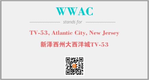 英文缩略词“WWAC”经常作为“TV-53, Atlantic City, New Jersey”的英文缩写来使用,中文表示:“新泽西州大西洋城TV-53”。本文将详细介绍英文缩写词WWAC所代表英文单词,其对应的中文拼音、详细解释以及在英语中的流行度。此外,还有关于缩略词WWAC的分类、应用领域及相关应用示例等。