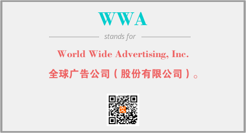 上述内容是“World Wide Advertising, Inc.”作为“WWA”的缩写,解释为“全球广告公司(股份有限公司)。”时的信息,以及英文缩略词WWA所代表的英文单词,其对应的中文拼音、详细解释以及在英文中的流行度和相关分类、应用领域及应用示例等。