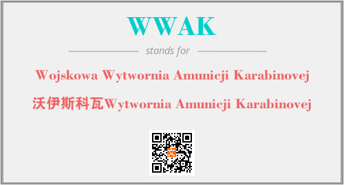 英文缩略词“WWAK”经常作为“Wojskowa Wytwornia Amunicji Karabinovej”的英文缩写来使用,中文表示:“沃伊斯科瓦Wytwornia Amunicji Karabinovej”。本文将详细介绍英文缩写词WWAK所代表英文单词,其对应的中文拼音、详细解释以及在英语中的流行度。此外,还有关于缩略词WWAK的分类、应用领域及相关应用示例等。