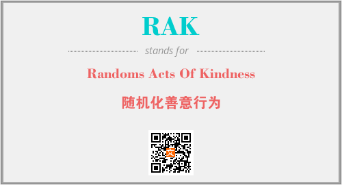 上述内容是“Randoms Acts Of Kindness”作为“RAK”的缩写,解释为“随机化善意行为”时的信息,以及英文缩略词RAK所代表的英文单词,其对应的中文拼音、详细解释以及在英文中的流行度和相关分类、应用领域及应用示例等。