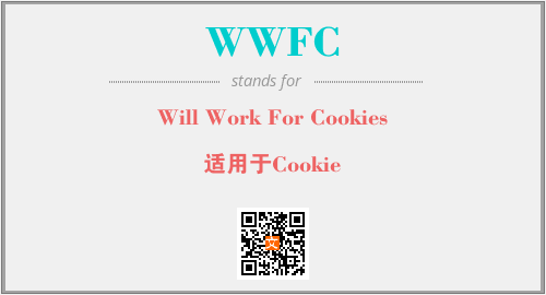 上述内容是“Will Work For Cookies”作为“WWFC”的缩写,解释为“适用于Cookie”时的信息,以及英文缩略词WWFC所代表的英文单词,其对应的中文拼音、详细解释以及在英文中的流行度和相关分类、应用领域及应用示例等。