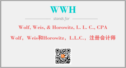 上述内容是“Wolf, Weis, & Horowitz, L. L. C., CPA”作为“WWH”的缩写,解释为“Wolf,Weis和Horowitz,L.L.C.,注册会计师”时的信息,以及英文缩略词WWH所代表的英文单词,其对应的中文拼音、详细解释以及在英文中的流行度和相关分类、应用领域及应用示例等。