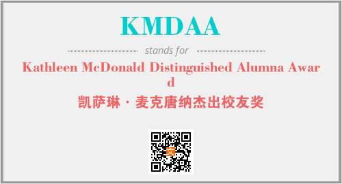 上述内容是“Kathleen McDonald Distinguished Alumna Award”作为“KMDAA”的缩写,解释为“凯萨琳·麦克唐纳杰出校友奖”时的信息,以及英文缩略词KMDAA所代表的英文单词,其对应的中文拼音、详细解释以及在英文中的流行度和相关分类、应用领域及应用示例等。