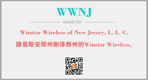 上述内容是“Winstar Wireless of New Jersey, L. L. C.”作为“WWNJ”的缩写,解释为“路易斯安那州新泽西州的Winstar Wireless。”时的信息,以及英文缩略词WWNJ所代表的英文单词,其对应的中文拼音、详细解释以及在英文中的流行度和相关分类、应用领域及应用示例等。