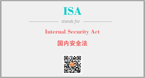 英文缩略词“ISA”经常作为“Internal Security Act”的英文缩写来使用,中文表示:“国内安全法”。本文将详细介绍英文缩写词ISA所代表英文单词,其对应的中文拼音、详细解释以及在英语中的流行度。此外,还有关于缩略词ISA的分类、应用领域及相关应用示例等。