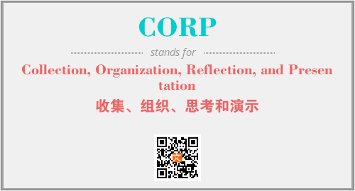 上述内容是“Collection, Organization, Reflection, and Presentation”作为“CORP”的缩写,解释为“收集、组织、思考和演示”时的信息,以及英文缩略词CORP所代表的英文单词,其对应的中文拼音、详细解释以及在英文中的流行度和相关分类、应用领域及应用示例等。