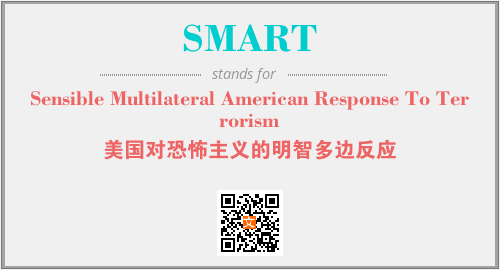 上述内容是“Sensible Multilateral American Response To Terrorism”作为“SMART”的缩写,解释为“美国对恐怖主义的明智多边反应”时的信息,以及英文缩略词SMART所代表的英文单词,其对应的中文拼音、详细解释以及在英文中的流行度和相关分类、应用领域及应用示例等。