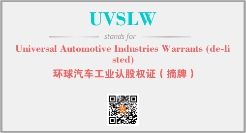 英文缩略词“UVSLW”经常作为“Universal Automotive Industries Warrants (de-listed)”的英文缩写来使用,中文表示:“环球汽车工业认股权证(摘牌)”。本文将详细介绍英文缩写词UVSLW所代表英文单词,其对应的中文拼音、详细解释以及在英语中的流行度。此外,还有关于缩略词UVSLW的分类、应用领域及相关应用示例等。