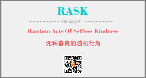 上述内容是“Random Acts Of Selfless Kindness”作为“RASK”的缩写,解释为“无私善良的随机行为”时的信息,以及英文缩略词RASK所代表的英文单词,其对应的中文拼音、详细解释以及在英文中的流行度和相关分类、应用领域及应用示例等。