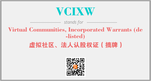 上述内容是“Virtual Communities, Incorporated Warrants (de-listed)”作为“VCIXW”的缩写,解释为“虚拟社区、法人认股权证(摘牌)”时的信息,以及英文缩略词VCIXW所代表的英文单词,其对应的中文拼音、详细解释以及在英文中的流行度和相关分类、应用领域及应用示例等。